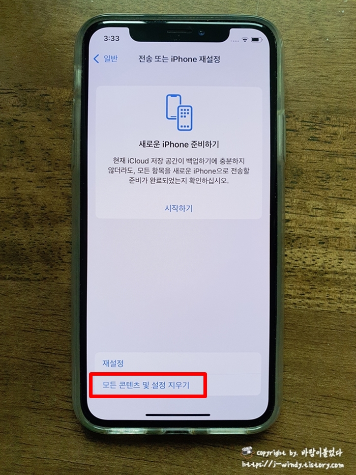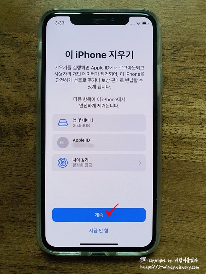 모든 콘텐츠 및 설정 지우기를 선택한 다음 '이 iPhone 지우기'화면이 나오는데 '계속'을 선택한다.