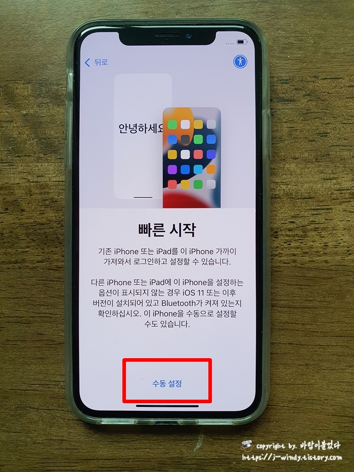 빠른 시작 화면이 보이면 '수동 설정'을 누른다.