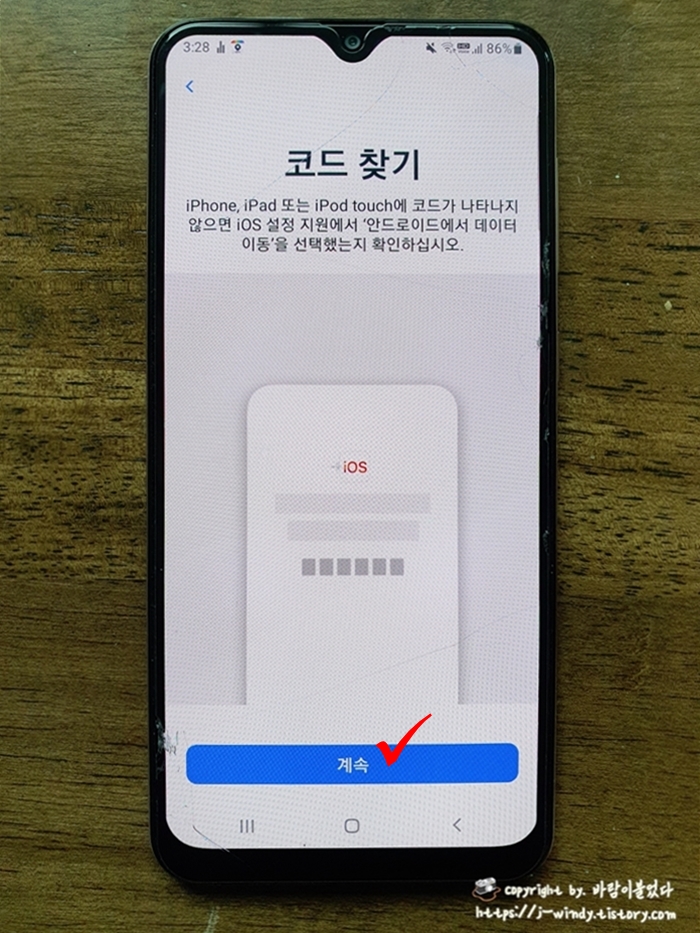 갤럭시에 코드찾기 화면이 보이면 '계속'을 누른다.