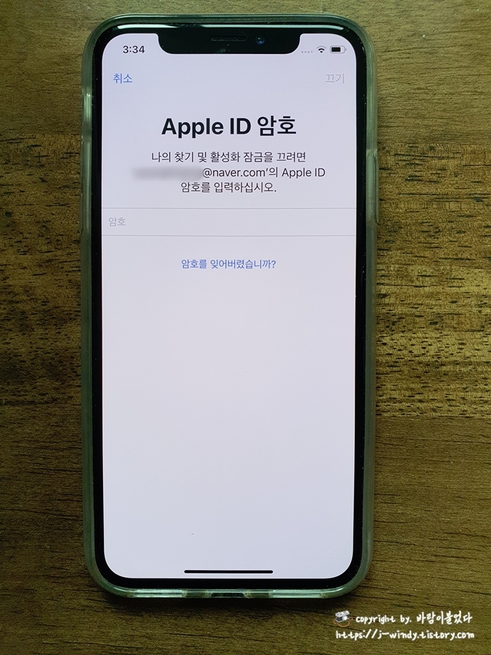 해당 기기의 아이폰 암호와 애플 ID암호를 차례대로 입력해준다.