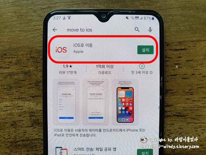 갤럭시 구글 플레이스토어에 들어가 'IOS'를 입력하면 가장 상단에 iOS로 이동이라는 어플이 보인다. 누적 다운로드가 무려 1억 회 이상이나 되는 국민 앱이라 볼 수 있다. 설치를 눌러 앱을 설치해준다.