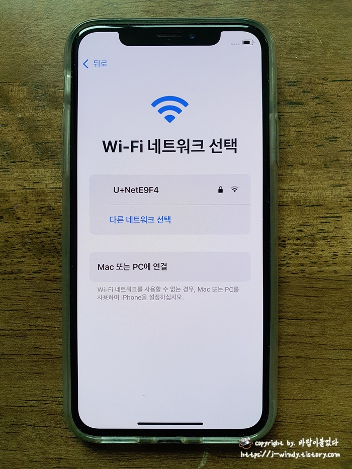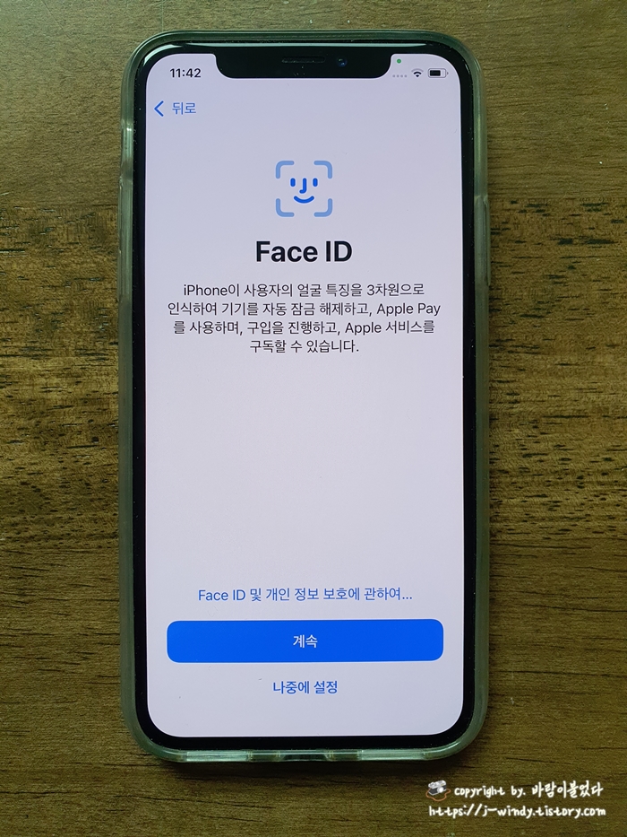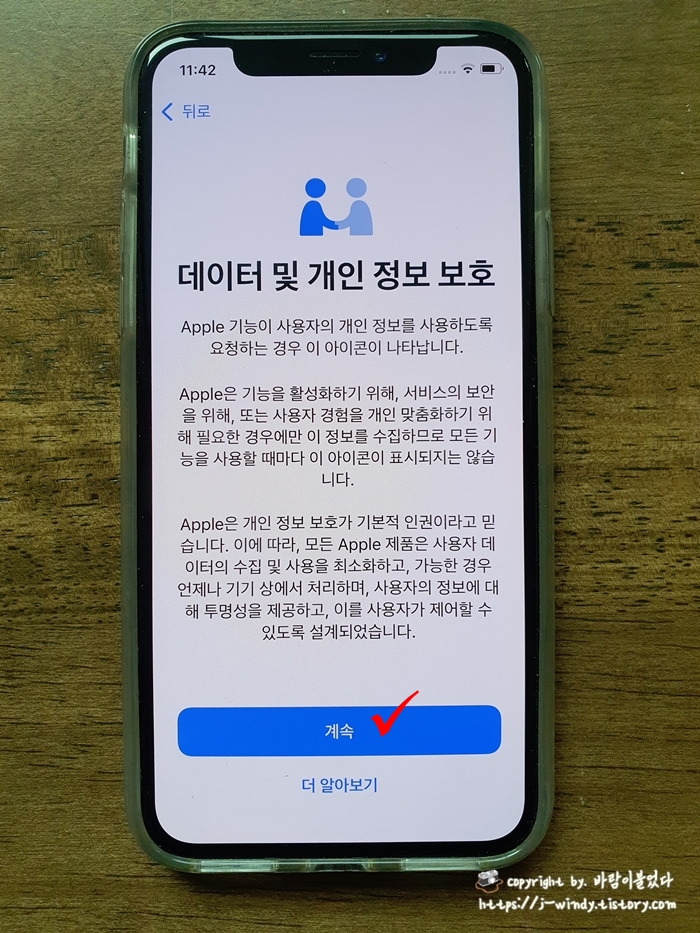 와이파이를 연결해주고 데이터 및 개인 정보 보호 화면에서 계속을 선택한다.