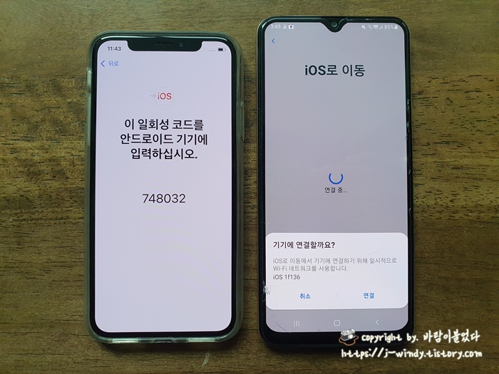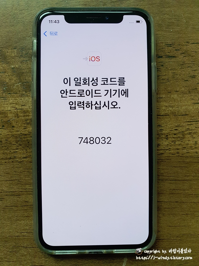 이제 아이폰과 갤럭시를 함께 놓고 갤럭시IOS앱에 일회성 코드를 입력해준다.