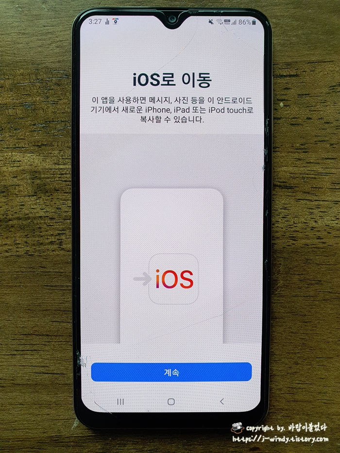 iOS로 이동 앱이 실행되면 화면 아래에 '계속'을 눌러 준 후 이용약관에 동의하자.