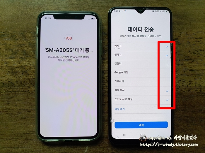 아이폰에서는 연결할 안드로이드 휴대기기의 모델명이 뜨게 되고 갤럭시 화면에서 데이터를 전송할 부분을 선택할 수 있다. 일반적으로 메시지, 연락처 사진 등을 많이 전송하게 된다. 필요로 하는 부분을 체크한 다음 계속을 누른다. 여기서 사진이나 영상을 전송하고 싶은 분들은 '파일 추가'를 선택하면 된다.
