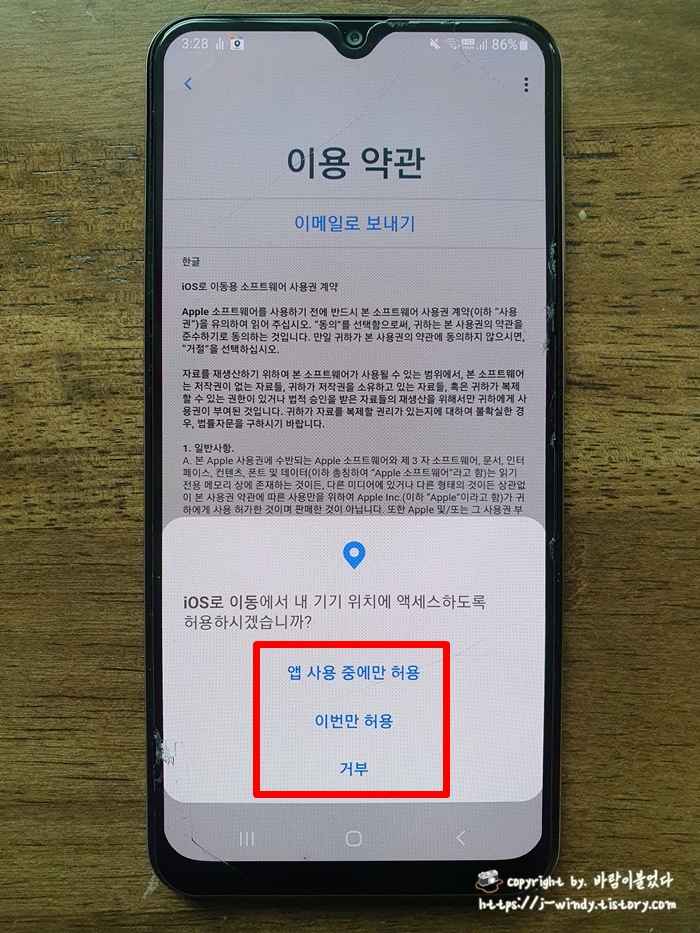 자동으로 보냄을 선택하고 다음 화면에서 '앱 사용 중에만 허용'을 선택하자. 어차피 이번 한번만 사용하고 삭제할 앱이기 때문에 어떤 것을 선택해도 상관은 없겠다.