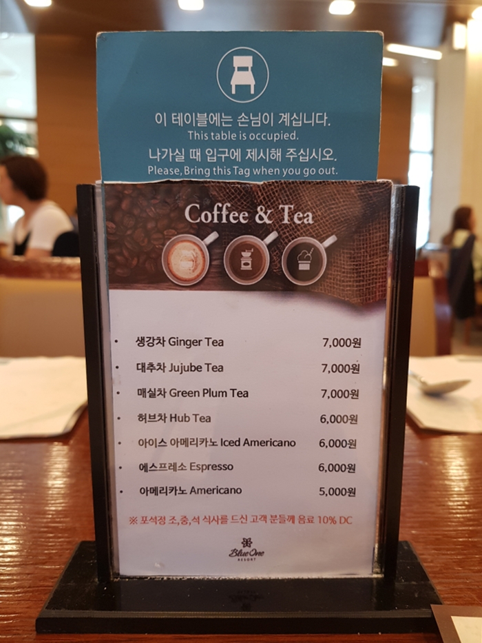 안내에 따라 테이블을 배정받습니다. 테이블 위에는 추가 음료가격과 알레르기 안내문구가 보이는군요.