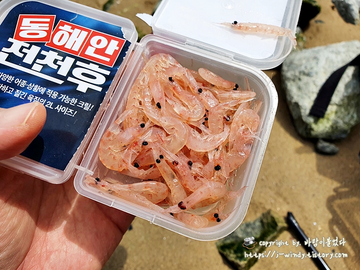 미끼는 위 사진에 보이는 작은 새우를 사용한다. 낚시방에서 간편하게 구입이 가능하고 사용하다 남은 것은 집 냉동실에 넣어두었다가 다음 낚시에 사용해도 무방하다. 판매 낚시점 마다 다르지만 내 기억으로는 한 4천원에 구입했던 듯?