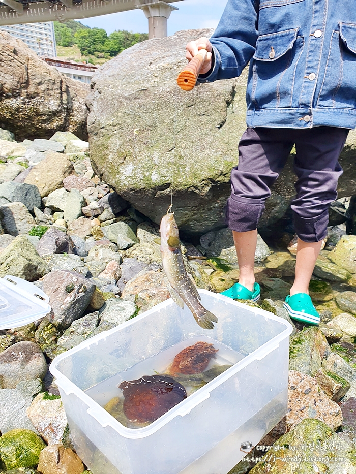 어쨌든 아이들이 정말 재미있어 하면서 바위 아래로 낚시대를 들이밀기 바쁘다. 위 사진은 중간점검.