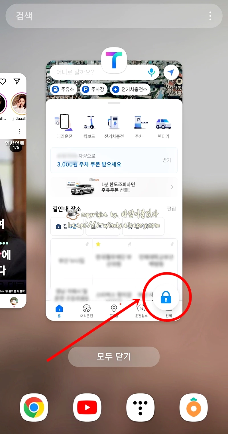 이렇게 설정해 두면 모두 닫기를 누르거나 앱 화면을 위로 쓸어 올려 작업 종료를 실행해도 해당 앱이 종료되지 않고 항상 고정되어 있을 것이다. 나는 주로 티맵에 이 기능을 사용한다. 다음은 최근 앱 해제 방법은 아래를 참고하자.