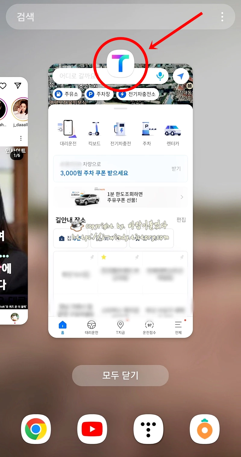 이럴 땐 '최근앱 고정' 기능을 활용해 모두 닫기를 눌러도 앱이 종료되지 않고 계속 실행되어 있게 설정할 수 있다. 나의 경우 운전 중 필수로 사용하게 되는 티맵이나 유튜브 뮤직 등을 사용할 때 이 기능을 사용한다. 티맵을 사용하는 분들이라면 해당 기능의 사용이 절실할 것이니 꼭 설정하도록 하자.