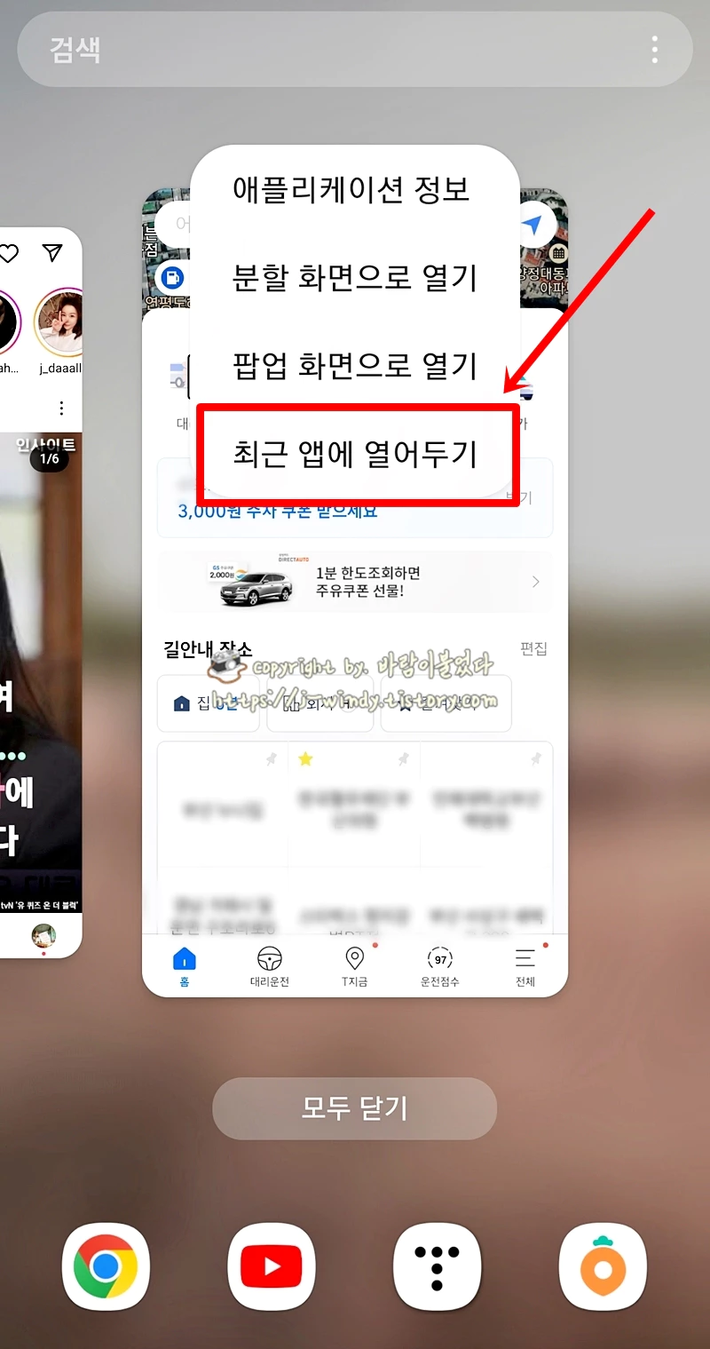 갤럭시 최근 앱 고정 방법(T맵 고정 등)