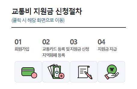 경기도 청소년 교통비 지원 포털 사이트를 통해서 온라인으로 신청할 수 있습니다. 회원가입, 교통카드 등록, 지역화폐 등록, 지원금 신청, 지원급 지급 순으로 절차가 진행됩니다.