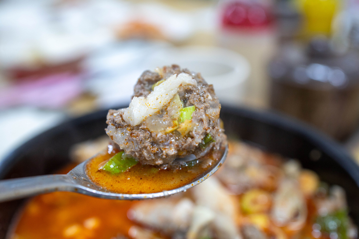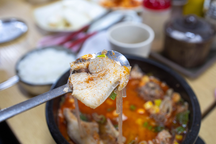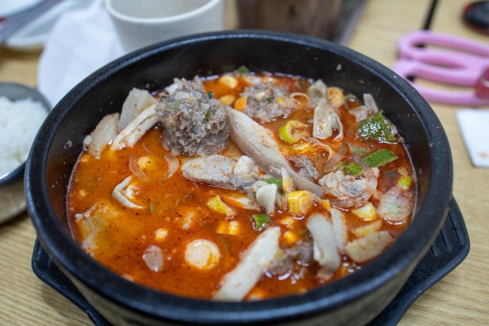 푹 우려낸 사골국물 아바이순대, 돼지머리고기, 돼지내장이 어울려 얼큰하고 구수한 맛을 내는 아바이순대국.