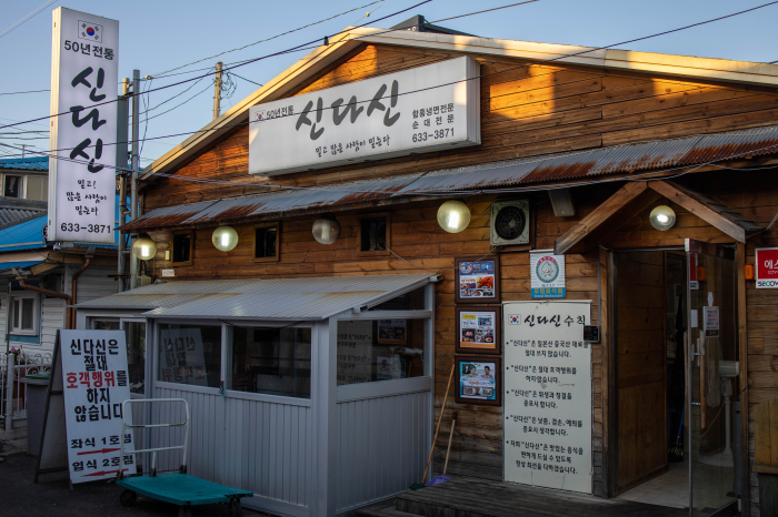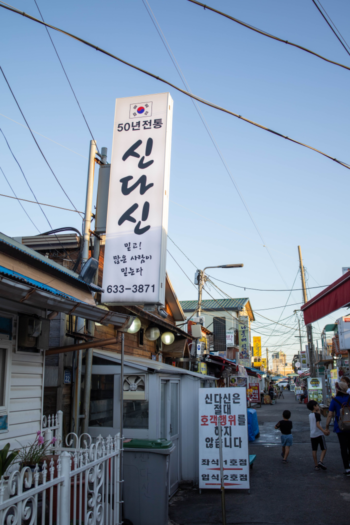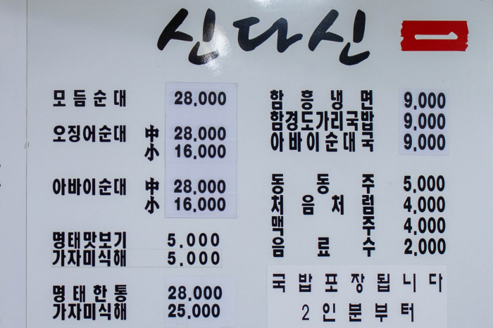 여행 계획을 세울때 멀리까지 여행와서 어떤 음식을 먹을까 많은 고민을 했었는데 아바이마을 안에 있는 '신다신'식당이란 곳에서 함경도가리국밥, 아바이순대국, 함흥냉면, 오징어순대, 아바이순대, 명태식해, 가자미식해를 한번에 먹어 볼 수 있다는 정보를 입수했다. 이 일대에는 정말 엄청나게 많은 식당이 밀집해있어 식당선정에 많은 애를 먹었었지만 마지막의 선택은 한 곳에서 다양한 음식을 먹어볼 수 있는 '신다신' 이다.