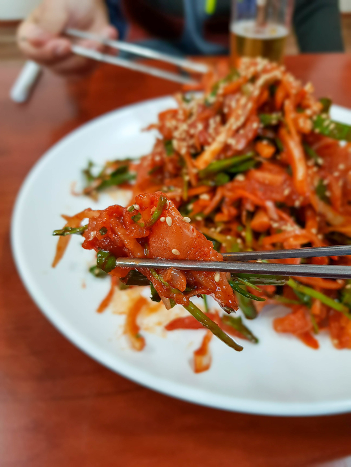 회를 즐겨하지는 않지만 이렇게 초장에 버무려 있으니 새콤하기도하고 미나리의 특유 향때문에 먹기 좋습니다. 질기지도 않았구요. 회를 즐겨하지 않는 저 같은 사람들에게도 만족스러운 회무침이었습니다.