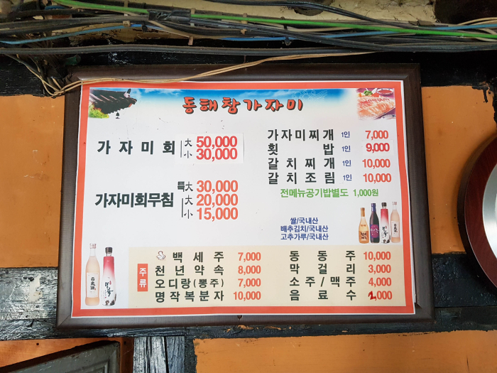 메뉴는 가자미회, 가자미회무침, 가자미찌개, 횟밥, 갈치찌개, 갈치조림이 있습니다.