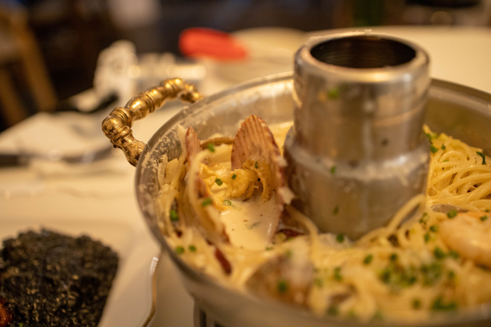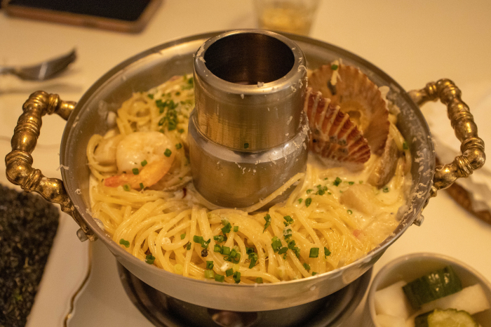 마냥 느끼한 크림파스타가 아니라 어떤 고추인지는 모르나 매운맛을 내는 재료가 들어있어 맛이 살짝 매콤합니다. 전체적으로 아주 맛도 좋은데다가 신선로에 담겨있으니 분위기와 맛이 배가 되는것 같습니다. 아주 만족스러웠답니다.