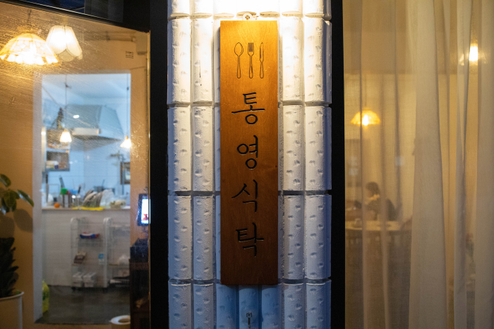 식당 입구 가운데 기둥에는 나무판에 '통영식탁'이라는 글귀가 각인되어 있었습니다.
