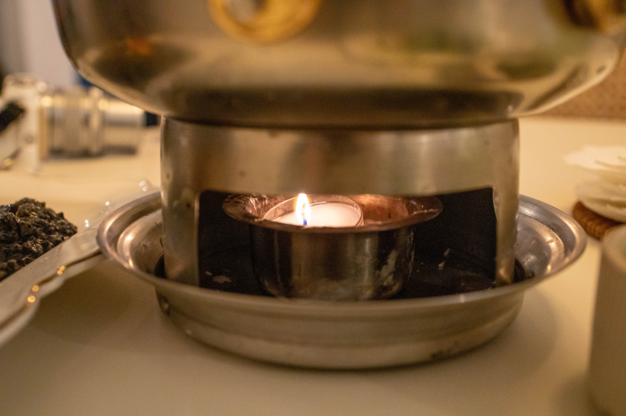 신선로 밑에는 작은 양초에 불이붙어있어 시간이 지나도 크림이 눅눅해지지 않고 따뜻함을 유지시켜 주었습니다.
