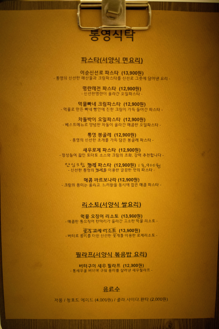 이순신선로파스타, 명란해전파스타, 통영봉골레 등 통영하면 떠오르는 주제들을 재미있게 해석한 메뉴이름들이 눈에 들어옵니다. 재료들 또한 통영의 해산물로 준비가 되는 듯 합니다.
