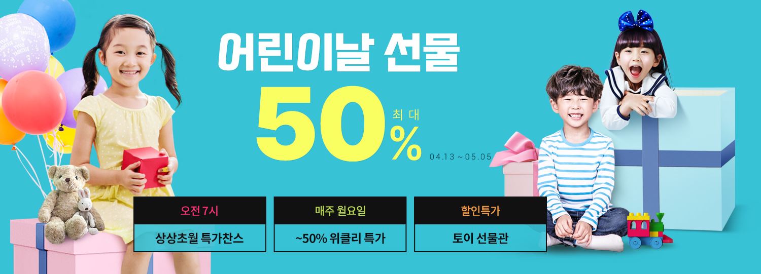 이벤트 기간은 4월 13일 ~ 5월 5일까지이며 오전7시 상상초월 특가찬스부터 매주월요일 최대50% 위클리특가 토이선물관은 상시할인특가를 내세우고있다.