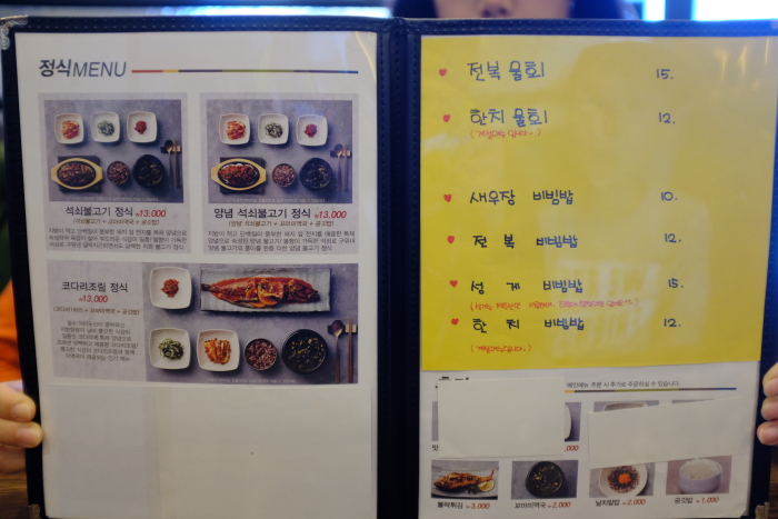 이렇게 메뉴들을 다 적어보니 비교해보지는 않았지만 오복미역보다 메뉴가 더 많아 보이기도합니다. 메뉴가 많았던 덕분에 메뉴 선정이 쉽지않았답니다. 미역국집이라 미역국만 먹을 생각으로 들어왔던 것이지만 석쇠불고기가 너무 먹어보고 싶어 가자미미역국 9,000원, 석쇠불고기정식 13,000원, 양념 석쇠불고기 정식 13,000원 3가지메뉴를 주문해 보았습니다.