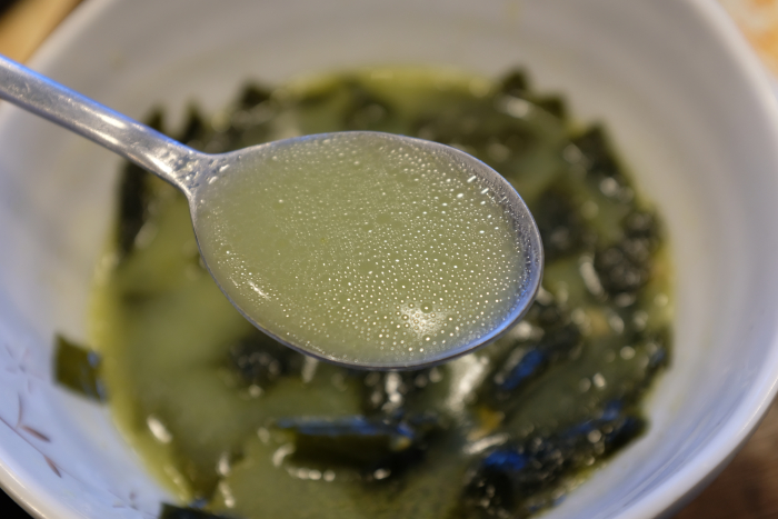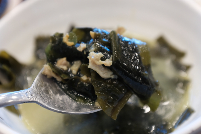 미역국안에는 잘게 다져진 조개의 모습도 보입니다. 덕분에 해산물을 좋아하시는 분들에게는 미역국 국물이 더 시원하게 다가올 것 입니다.