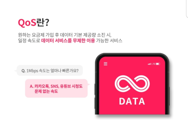 기본제공데이터 1.4GB를 모두 소모하게되면 Qos서비스를 통해 원래 데이터속도보다 느린 속도로 데이터통신이 이루어지게 됩니다.