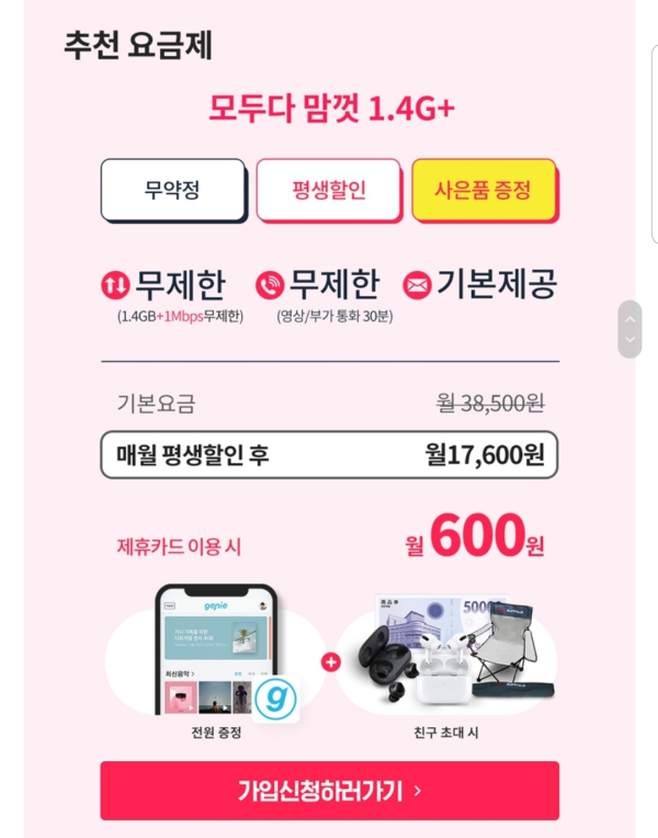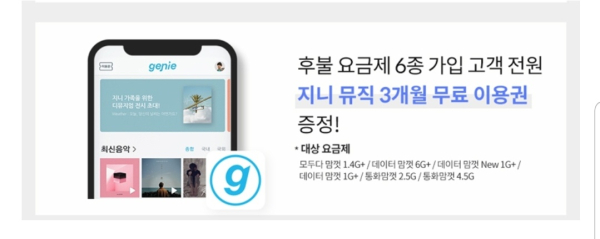 그리고 가입기간 상관없이 모두다맘껏 1.4G+ 요금제를 가입할 시 '지니 뮤직 3개월무료 이용권'이 제공됩니다.