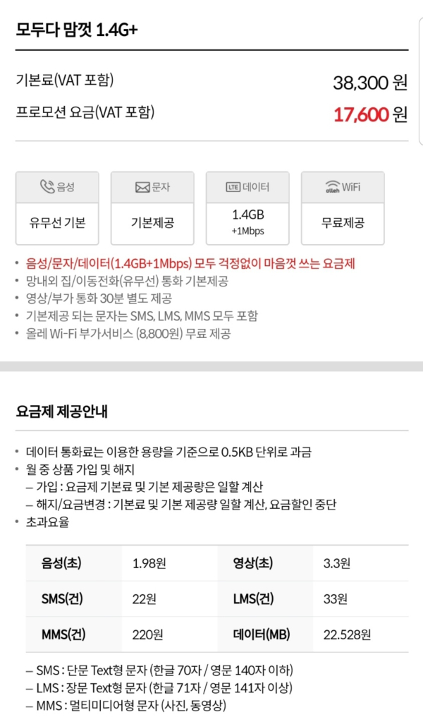 - 데이터 1.4G 에 소진시 1Mbps로 무제한 이용가능