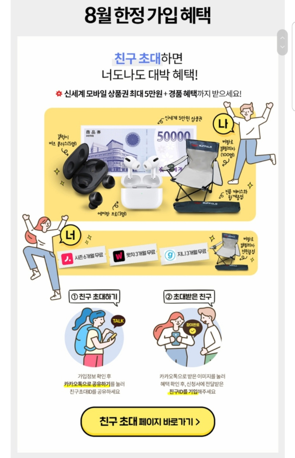 친구초대를 하면 신세계모바일상품권 5만원에 경품까지 제공하지만 실질적으로 KT M 모바일을 사용하고 있는 분이 친구초대해야하기때문에 주위에 KT M 모바일을 사용하는 사람이 없다면 그림의 떡인 이벤트입니다.