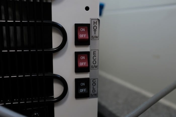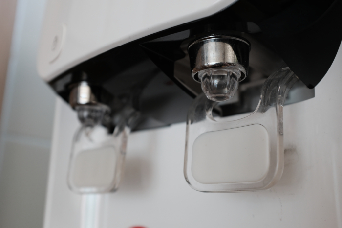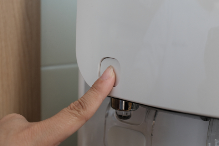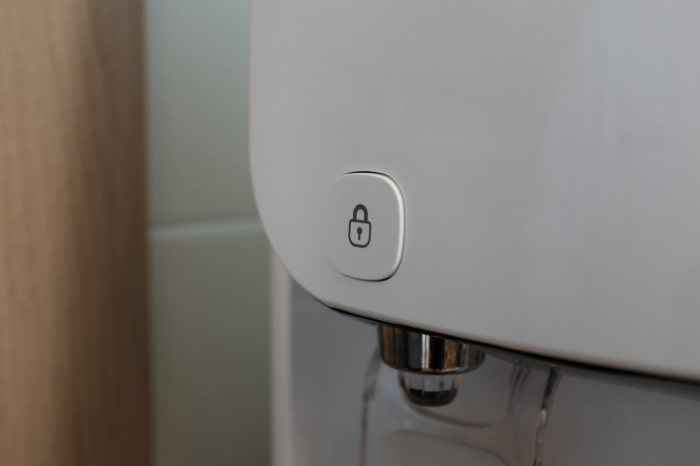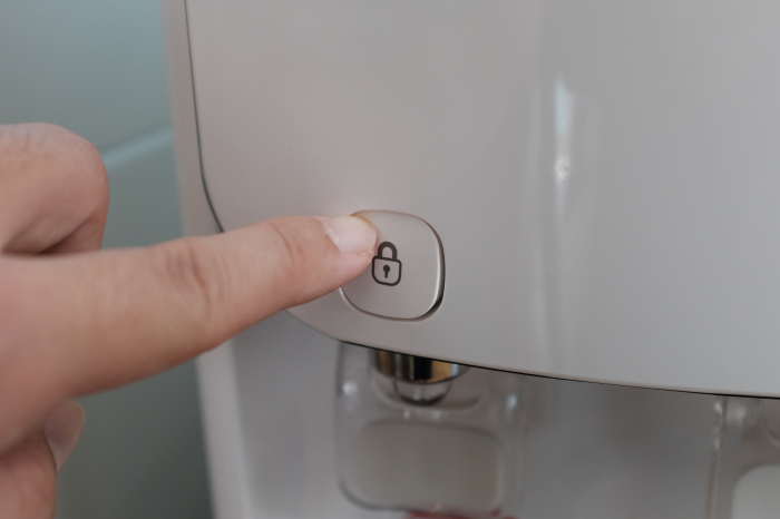 루헨스 냉온정수기 WHP-1810S의 경우 뜨거운 물 기능을 사용하기위해서는 제품 본체에 설치된 자물쇠모양의 아날로그버튼을 먼저 눌러줘야합니다.