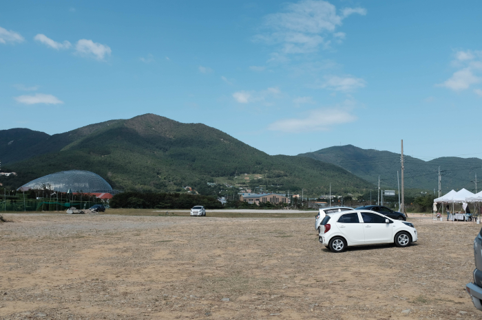네비게이션의 안내에따라 목적지에 도착할때즈음이면 1차선의 도로 왼편으로 '거제시 핑크뮬리 임시주차장' 안내 현수막이 커다랗게 보이실 겁니다. 현수막의 안내를 따라 좁은 시골길 입구에 진입하게되면 생각보다 아주 넓은 공간의 주차장을 만나실 수 있습니다.