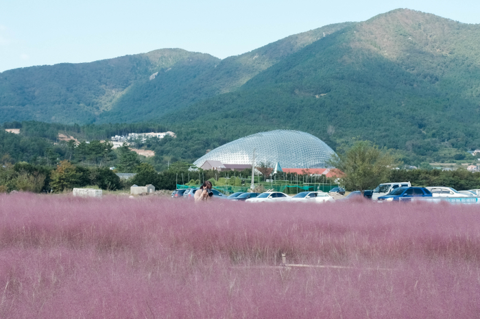 핑크뮬리단지 너머로 올해 개장된 정글돔의 모습이 보입니다.