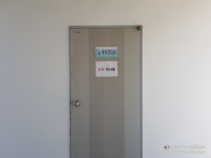 노지캠핑 위치선정에 있어 아주 중요한 화장실. 이 곳은 방문하는 사람이 더럽혔으면 더렵혔지 보통은 깨끗하게 관리가 되고 있었다. 남자화장실 기준 소변기 3개 대변기 1개, 가족화장실 1개, 세면대 3개가 설치되어있었는데 대변칸에 화장지도 준비되어있고 세면대에는 비누와 세제도 채워져 있어 손을 씻기 편했다. 보통 이른 아침시간에 청소하시는 분께서 깨끗하게 정리를 해두신다. 모래해수욕장이기 때문에 곳곳에 젖은 모래가 있을 수 있다.