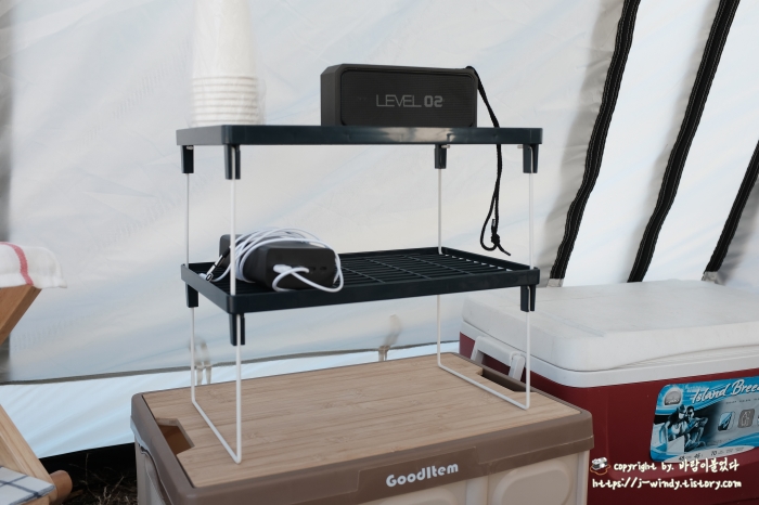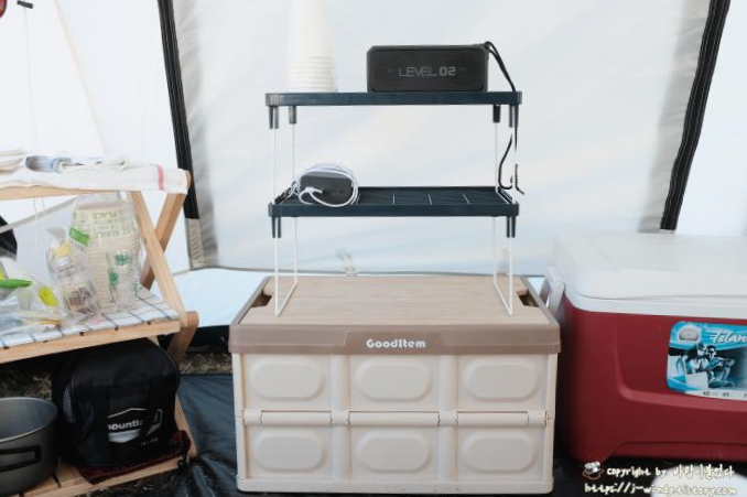 캠핑을 하다보면 블루투스스피커, 충전기, 램프등, 컵, 그릇 등 자잘한 물건들을 올려둘 공간이 필요하게 됩니다.