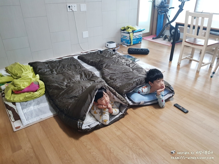 아이들은 집에서도 따듯한 침낭안에서 나오려하지 않을때가 많다.