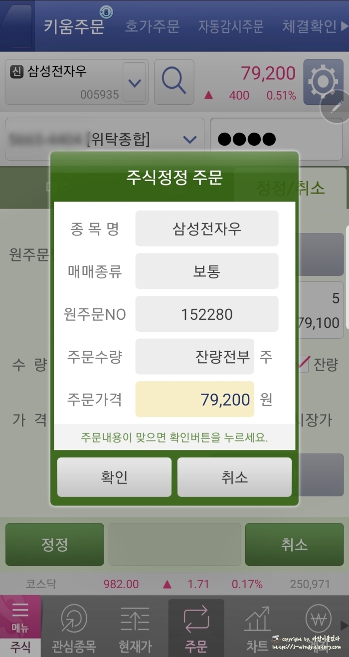 주식정정주문 화면이 팝업되면 주문내요이 맞는지 다시 한번 확인 한 후 확인을 눌러준다.