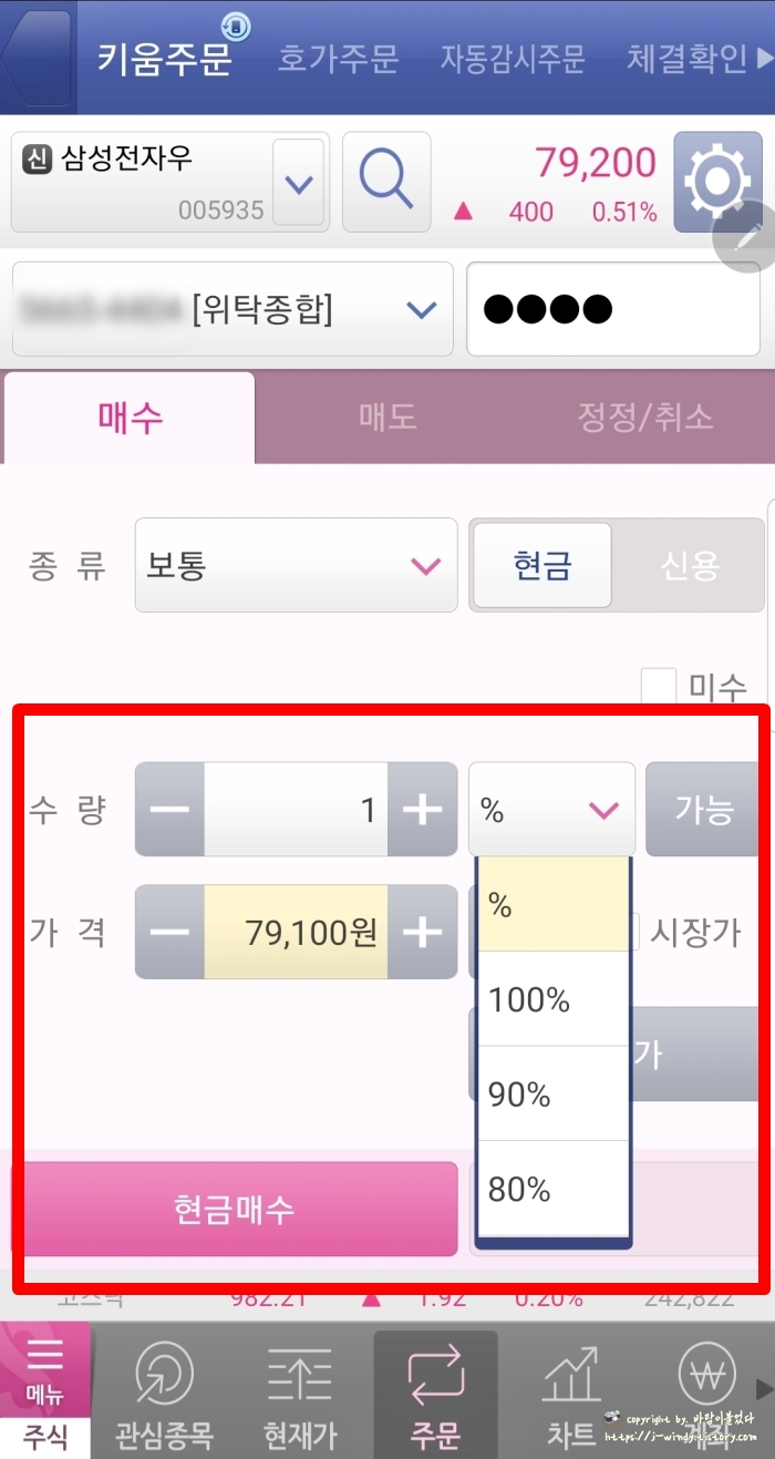 수량 옆의 칸을 선택하면 본인의 현금비중에서 퍼센트 단위로 선택해 매수도 가능하다.