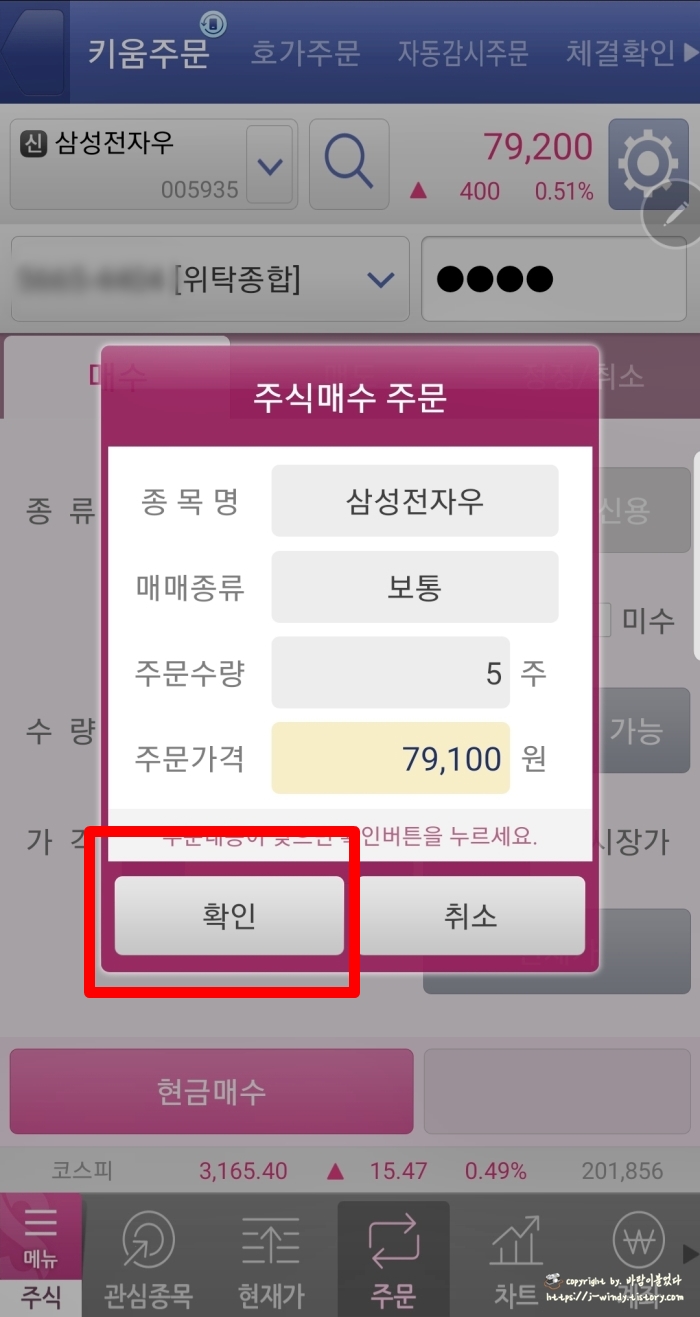 현금매수를 누르게되면 주문 내용을 확인하할 수 있는 '주식매수주문'화면이 팝업된다.