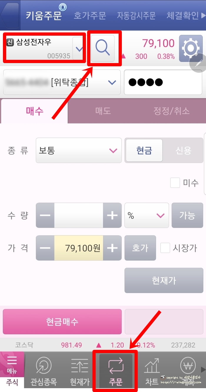 메인 화면은 본인의 설정에 따라 다를 수 있음을 참고 바라며 화면 아래에서 '주문'을 선택 한 후 상단의 '돋보기'를 선택해 본인이 사고자하는 주식종목을 입력한다.