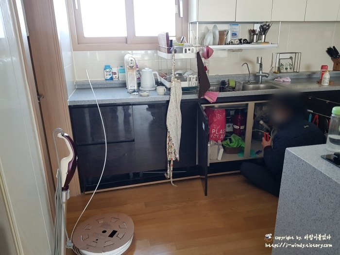 설치기사님 편하시게 설거지그릇통을 그냥 바닥으로 내려버리니 싱크대에 바로 물을 흘려보낼 수 있어서 편했는데 만약 이런 여건이 안된다면 커다란 양동이통을 이용해 물을 받으면 된다.