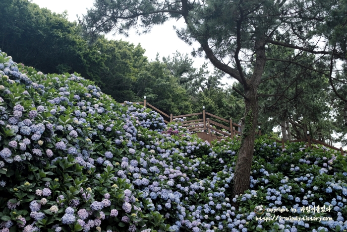 거제 수국축제 저구항과 파란대문집 만개한 수국근황 봄을 지나 6월이 되면 거제도에는 구조라에서 동부면과 남부면을 가로지르는 해안도로를 따라 길 주위로 수국이 지천으로 피기 시작한답