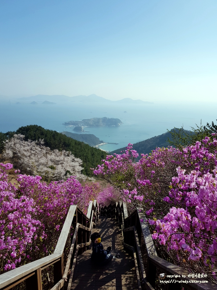 진달래축제로 유명한 거제도 대금산. 진달래와 벚꽃이 만개하는 시기에 맞추어 방문하면 산기슭부터 산정상까지 흐드러지게 피어있는 진달래 꽃을 만나 볼 수 있다. 정상으로 오르는 길에는 진달래꽃터널도 만나 볼 수 있다. 산세가 순하기 때문에 나처럼 등산에 취미 없는 사람들도 오르기 좋은 산이다.