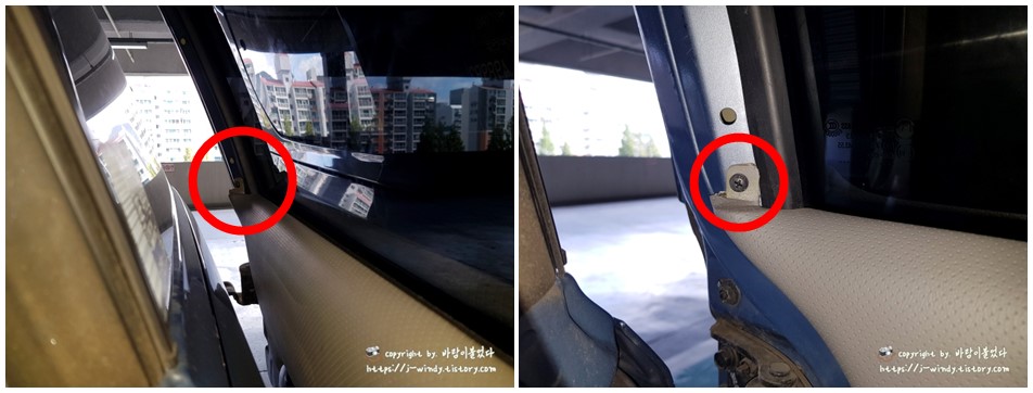 그리고 앞서 제거해 두었던 뒷 부분의 나사머리도 지금 미리 조여 놓는다. 나중에 깜빡하면 문짝과 비닐을 다시 뜯어야하는상황이 발생할 수 있기 때문이다. 나는 실제로 작업이 다 끝난 다음에야 저 나사를 조으지 않았다는 사실을 알고는 문짝과 비닐을 뜯어야했다. :(