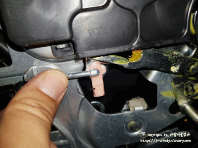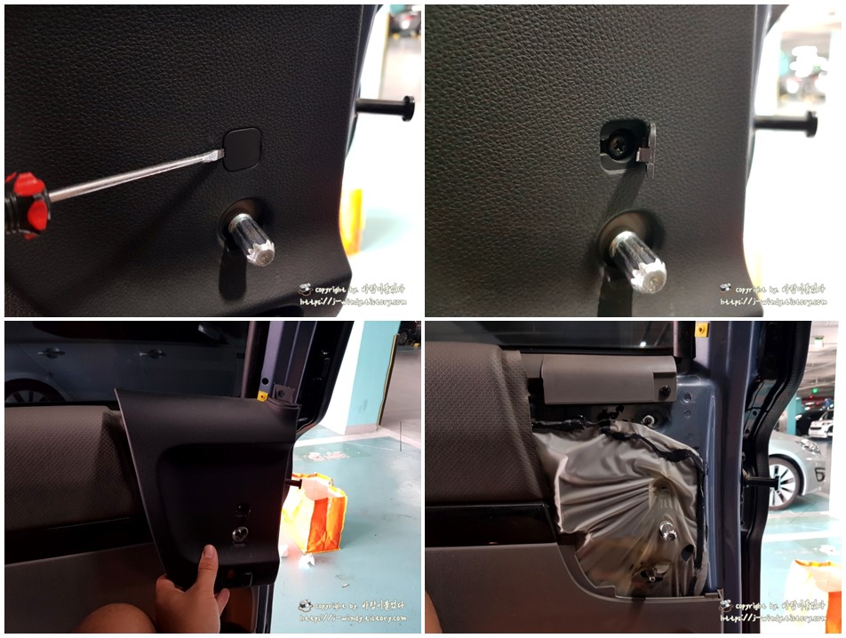 조금전 십자나사를 제거한 도어 뒷쪽편에 헤라를 집어 넣고 내장제를 때어내준다. 위 사진의 두번째까지만 뜯어내면된다. 이제 다시 앞으로 넘어와 컵홀더를 손으로 잡고 자신의 몸쪽으로 확~! 하고 힘있게 당겨준다. 그럼 내장제가 뚝하고 떨어져 나갈 것이다. 그런 후 도어트림을 위로 들어 빼내어주면 도어트림 탈거작업은 완료가 된다.