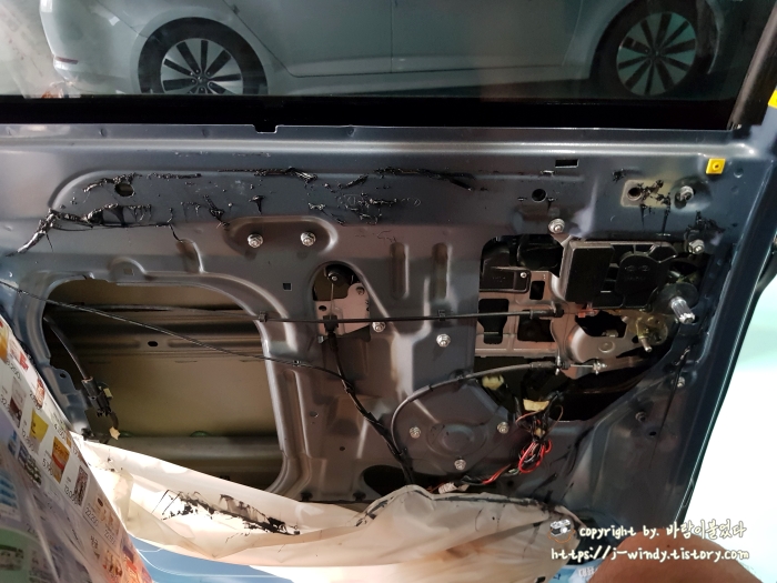 뜯겨져나간 도어트림과 비닐로 둘러싸여진 내부모습. 여기까지 따라와 주었다면 이제 딱 반 정도 남은 상황!