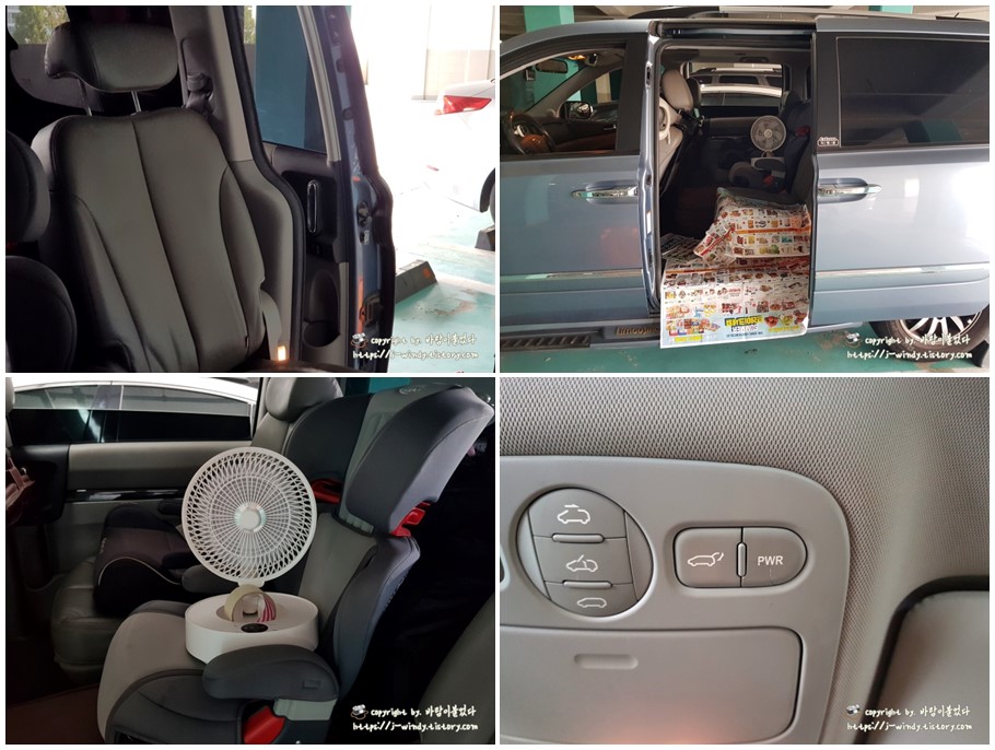 나처럼 한여름에 작업하는 사람들이라면 무선 선풍기라도 하나 가져다 놓고 작업하면 훨씬 쾌적한 작업이 될 수 있다. 포스팅을 위한 사진을 남기기 전 오른쪽 오토슬라이딩도어 도어래치를 교체해 보아서인지 경험상 2열시트용 안전벨트는 오염이 될 수 있으니 뒤로 넘겨 두는 것이 좋으며 도어탈거했을때의 검은 본드가 차 내장제에 묻지 않기위해 신문지등을 이용해 커버를 씌우는 방법도 좋을 것이다.(해보면 암)