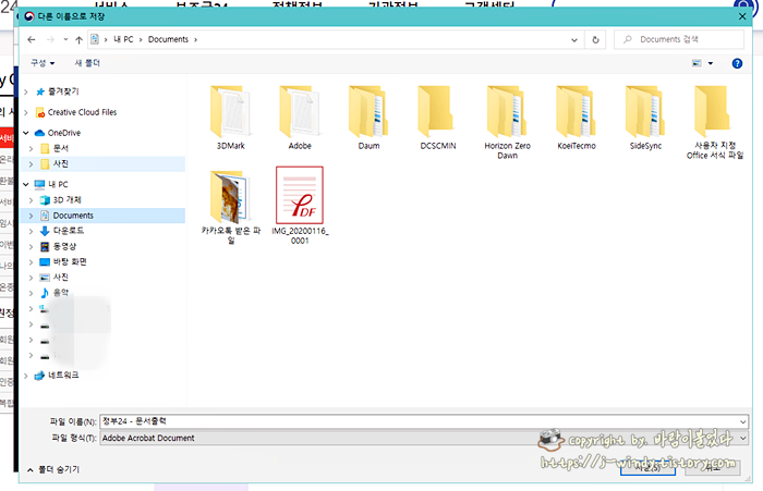 저장하고자하는 위치를 설정한 후 저장을 누르면 주민등록등본이 내 컴퓨터에 저장이 된다. 이 파일을 이용해 이메일이나 카카오톡(카톡)으로 제출이 필요한 곳에 전송하면 끝이다.